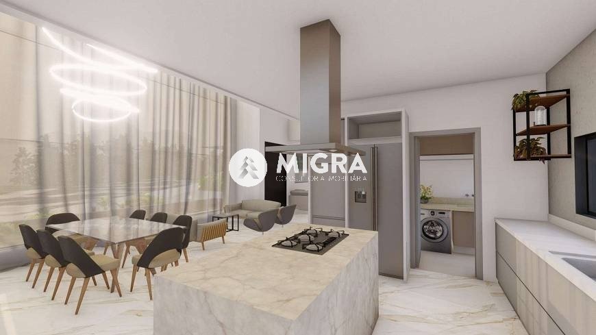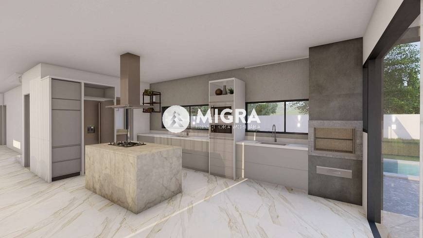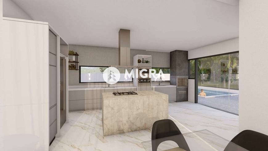 Cozinha americana com ilha e área gourmet integrada.